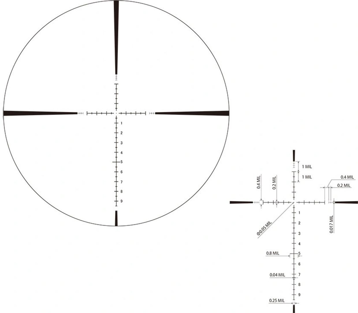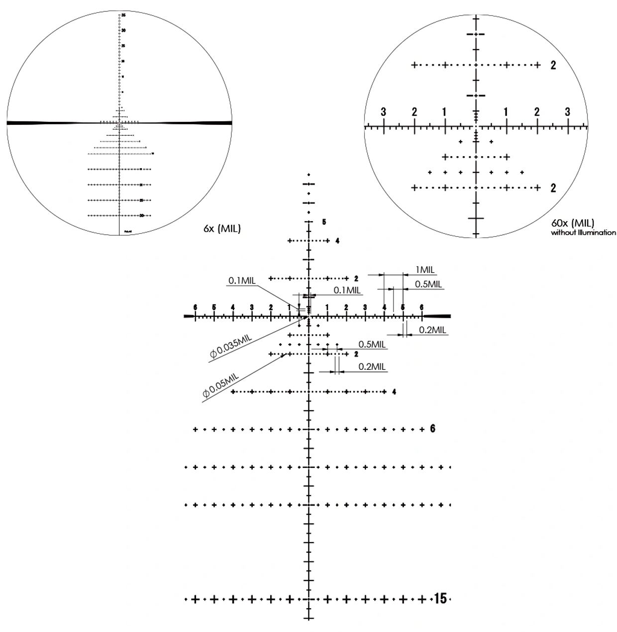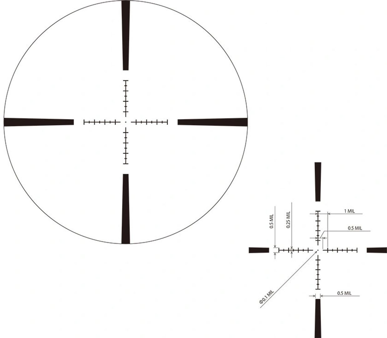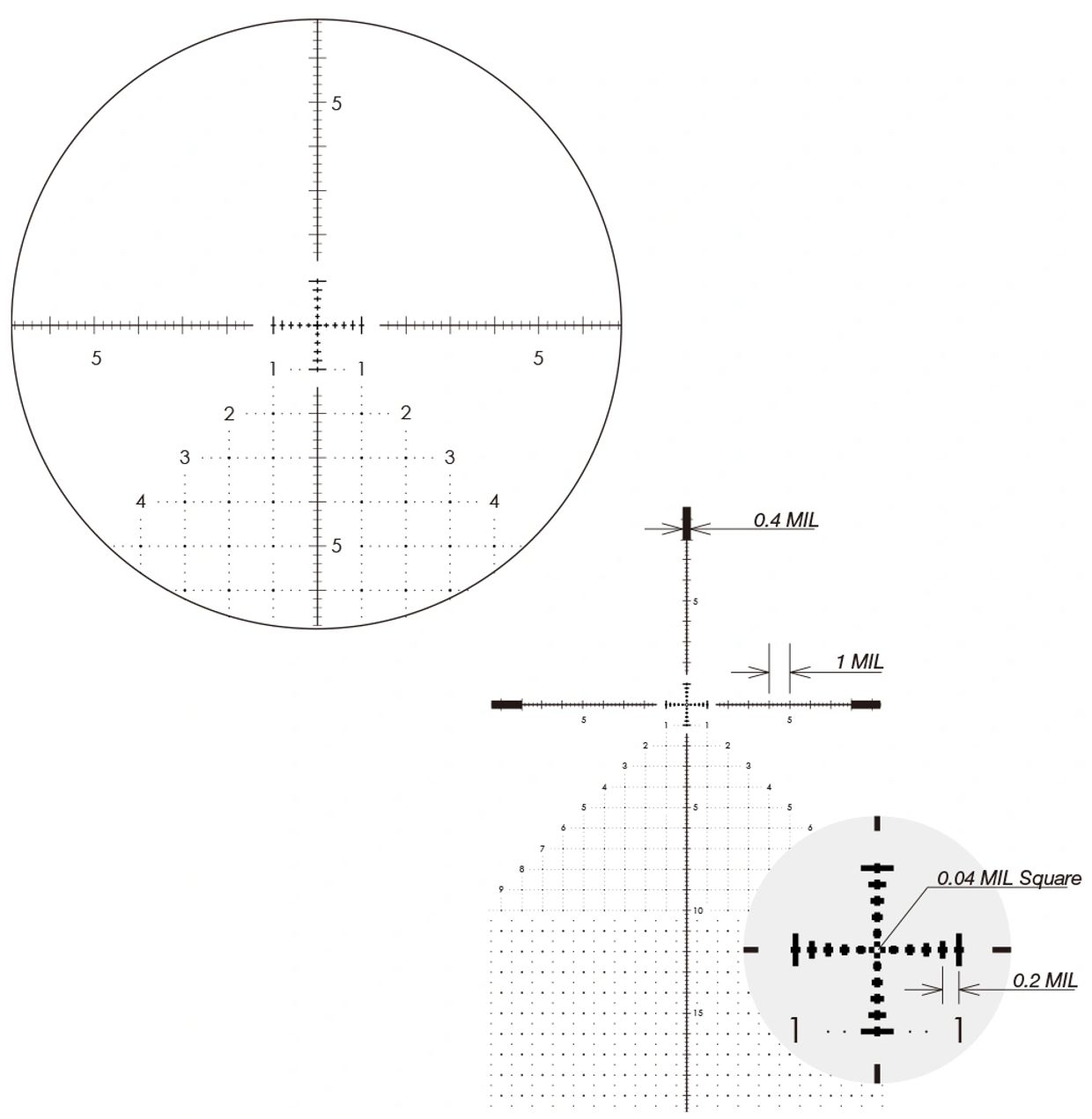 New competition oriented First Focal Plane reticle is designed for precise holdover without obscuring the sight picture. In the illuminated version centre dot and cross are illuminated with .2 mrad and .5 mrad hash marks throughout.