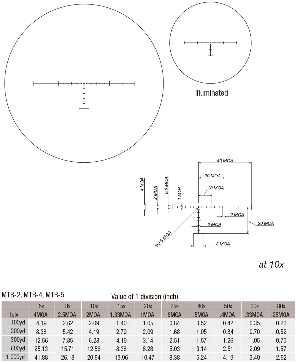 To calculate the amount of the target that will be covered by the reticle line or dot at any magnification; use the reticle line size given in MOA and multiply it by the magnification given. Then divide that number by the magnification for which you desire to know how much of the target will be covered by the reticle line or the dot. That resultant will be the amount of area measured in MOA that the reticle line or dot will cover on the target. The MTR-5 reticle diagram is illustrated at 10x (10 magnification). When set at 10 magnification the reticle line covers 0.2 MOA. At 100 yards (approximately .2 inches) and the dot covers 0.5 MOA at 100 yards (approximately .5 inches). The following calculation is to determine the MOA coverage of the line and dot at 60x:.2 x 10 = 2 divided by 60 = .03 MOA.Therefore at 60 magnification the reticle line covers aproximately .03 inches at 100 yards. As the target gets farther away it's image becomes smaller and the line then covers more of the target.Therefore at 60x at 1000 yds the reticle lines, horizontal and vertical will cover .03 MOA x 10 (One hundred yard intervals) = 0.3 MOA (approximately .3 inches) coverage of the 5 inch X ring on a F Open Class target at 1000 yds. The same theory applies to the amount of coverage of the Dot on a target at any magnification setting that you choose to set your scope.MTR-5: The Dot size given is 0.5 MOA x 10 magnification = 5. Five divided by 60 magnification = .083 MOA. Therefore when the magnification is set at 60 power; at 1000 yds the Dot will cover .083 x 10 = approximately .83 inches of the 5 inch X ring on a F Open Class target. It will actually be .8725 inches; as one MOA will actually cover 1.047 inches at 100 yds. The answer will be in MOA.